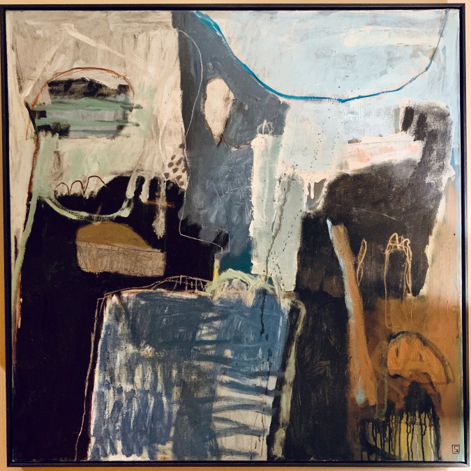 Large framed canvas with complex colour outcome. This work has been selected to be hung at the annual Friends of Mosman exhibition 22/2-23/3.