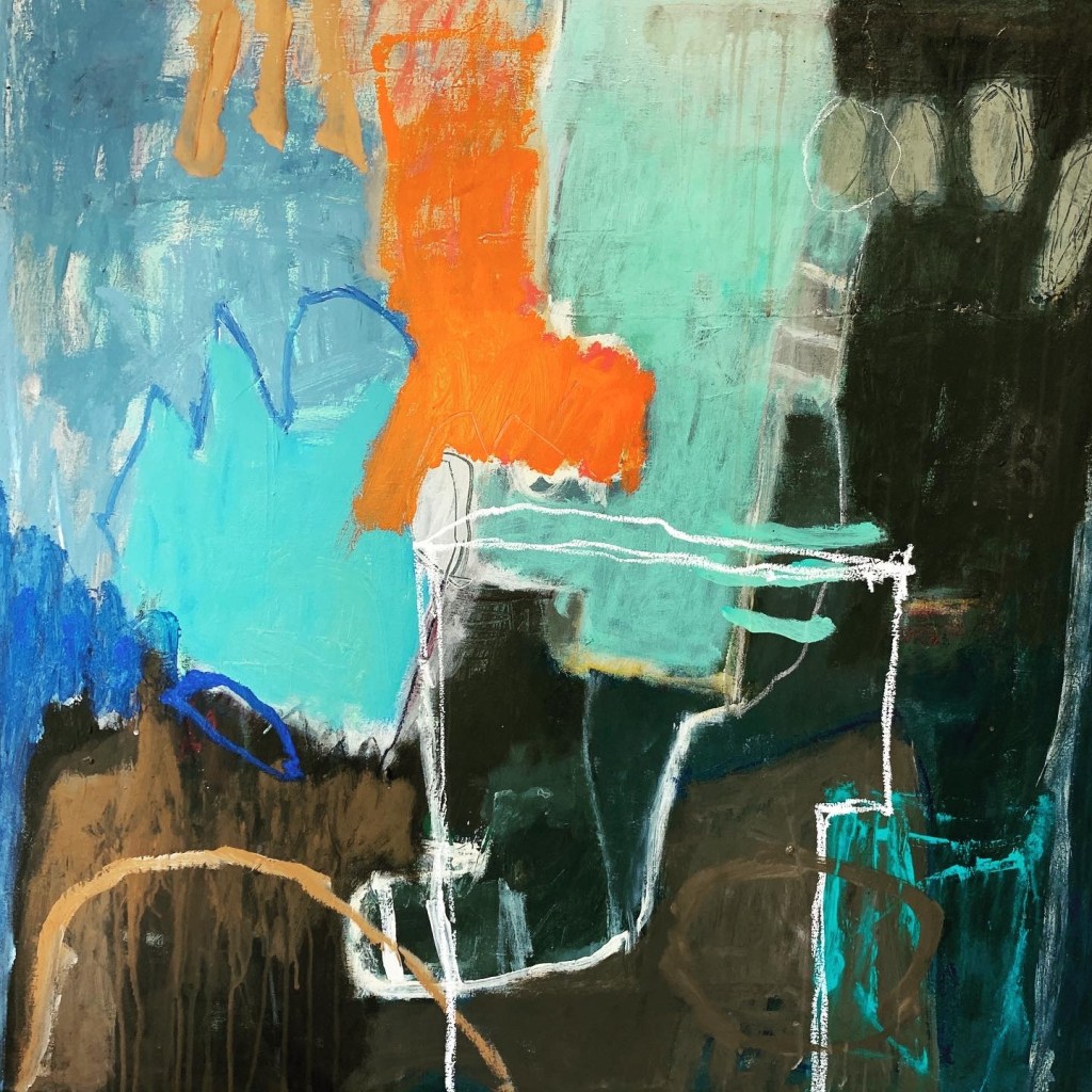 Works on paper unframed 50x65cm each. I consider these 3 works to be successful as a triptych as, although they were not painted with a grouping in mind, they are having an interesting conversation! The colours are complex and the markmaking is loose and interesting…..in my opinion.