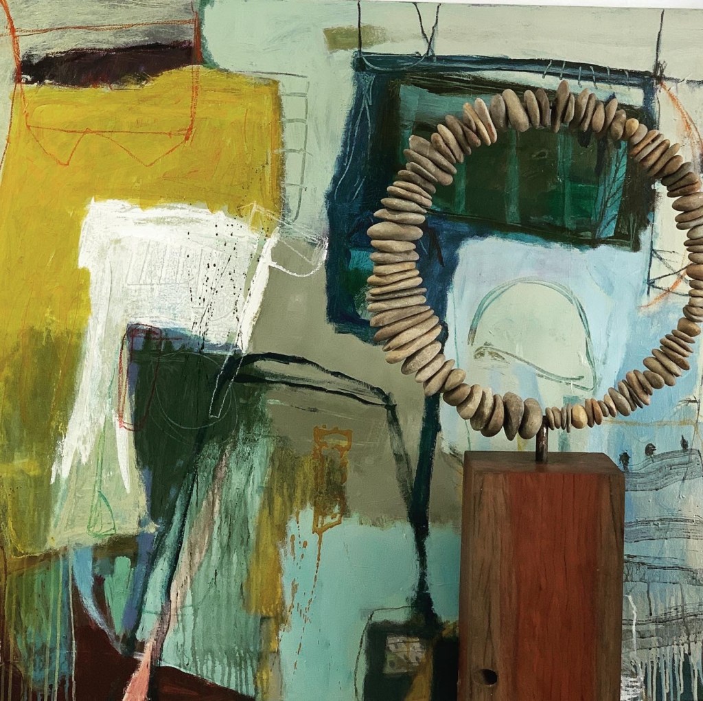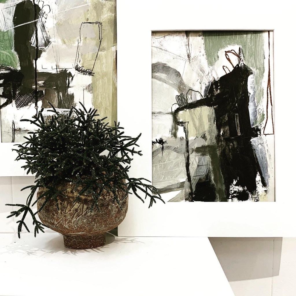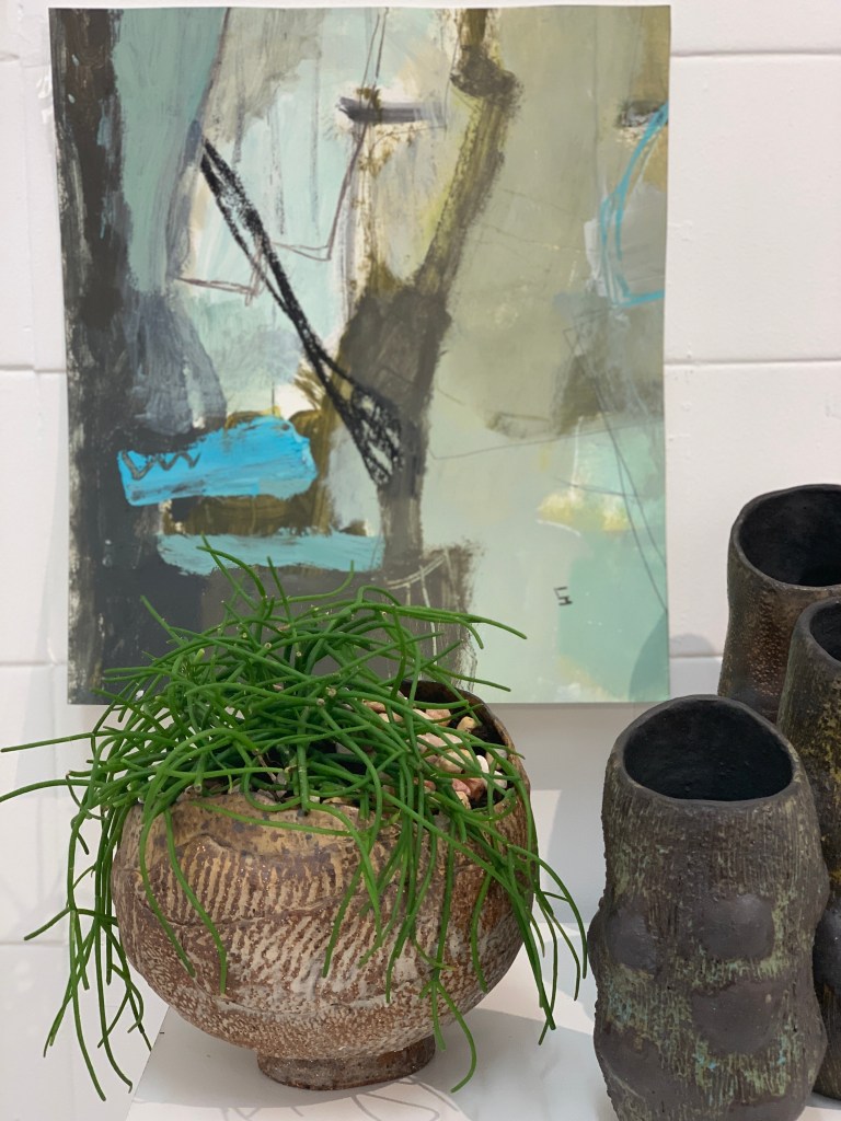 A beautiful combination of colour, texture and shapes going here. My large colorful canvas talking to a stunning river stone sculpture by Leone Harris and my works on paper teaming up with Shellie Christian’s ceramics with succulents….terrific textures .