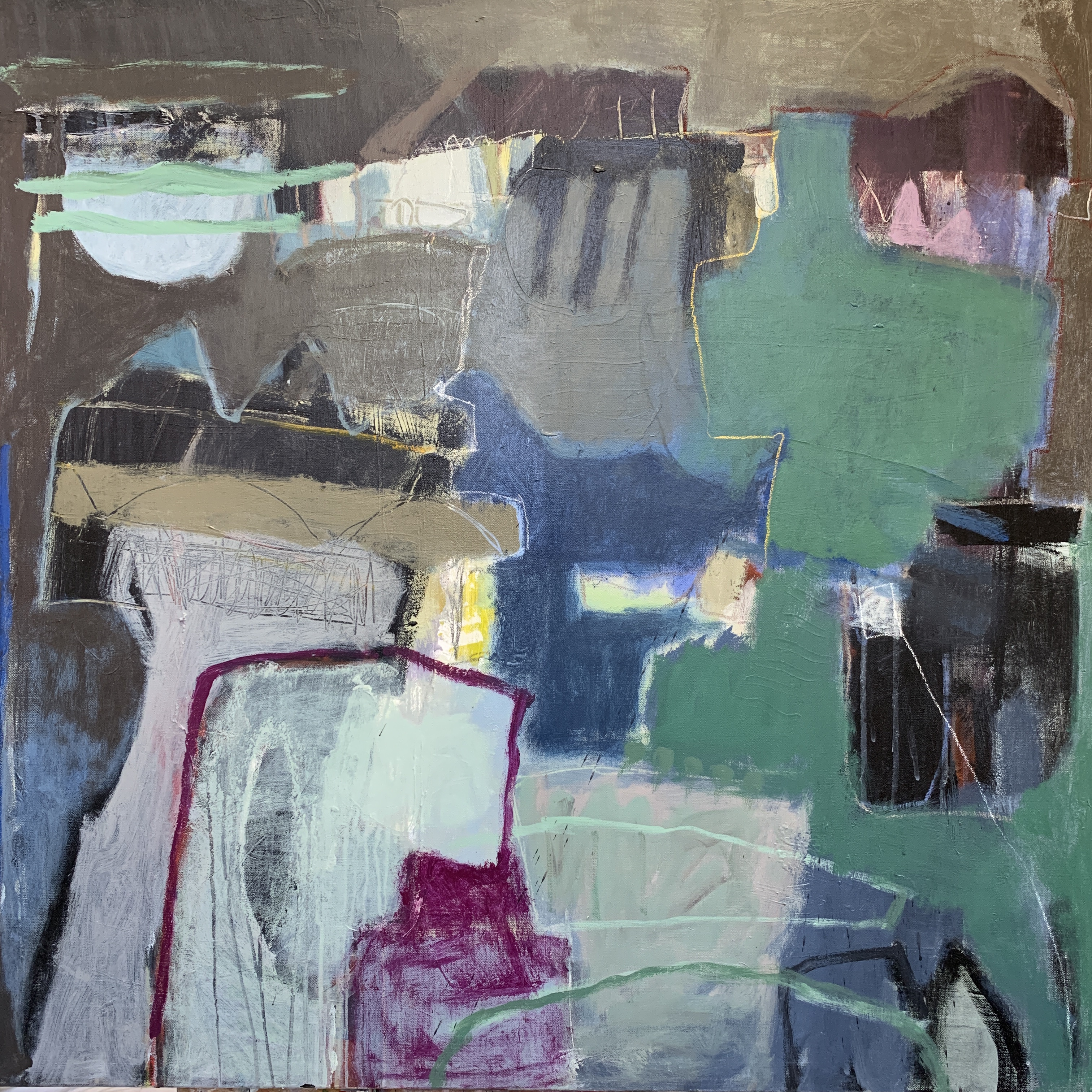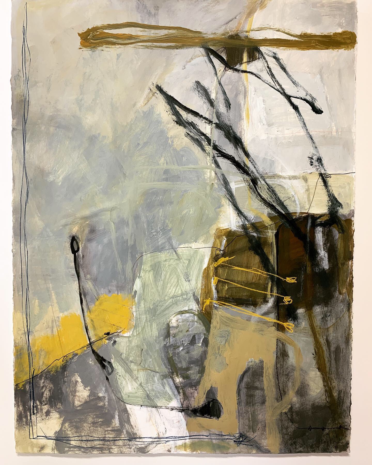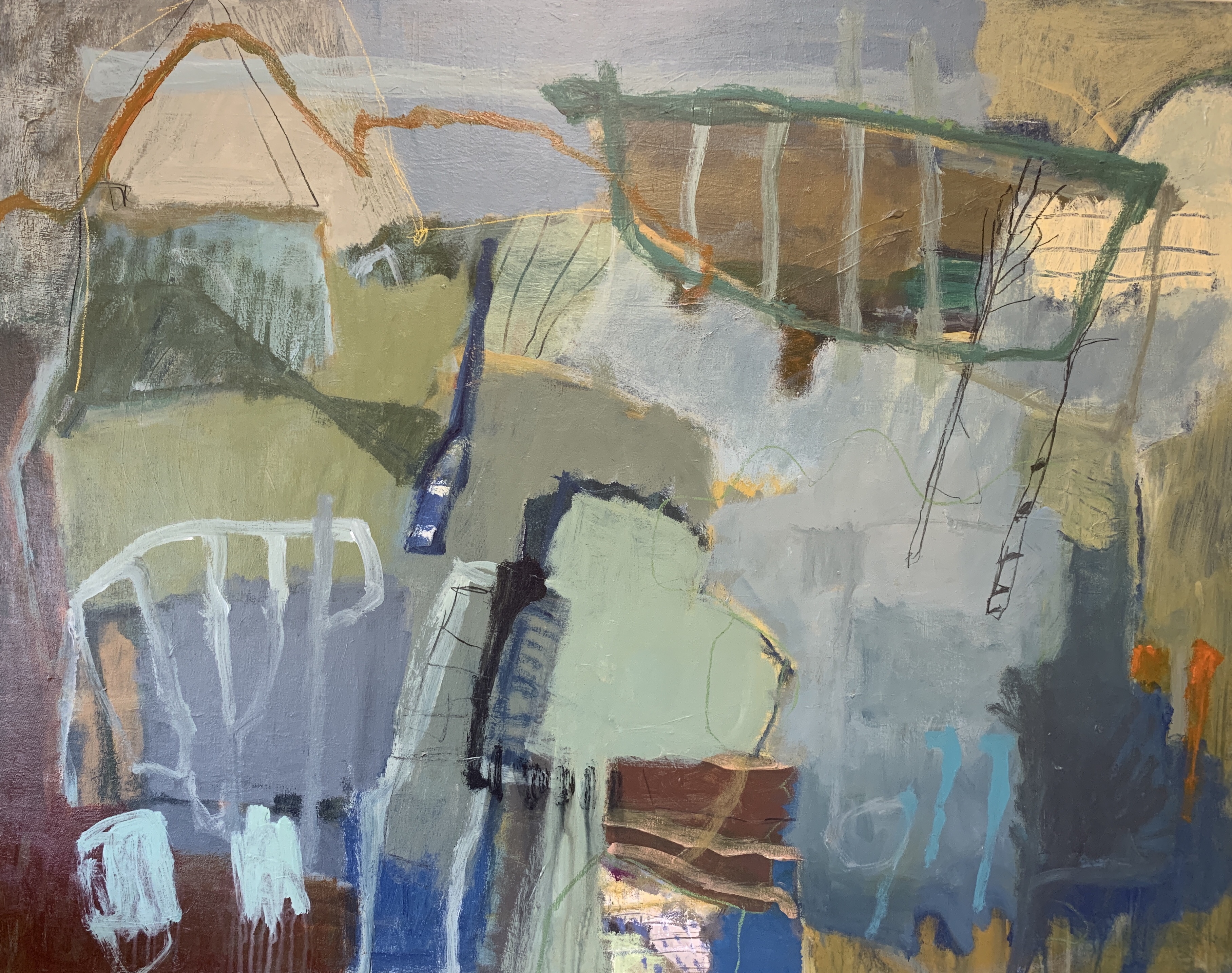 This piece is more obviously a landscape than my usual work. Sometimes shapes and colours speak loudly and countryside appears ! Our drought ravaged country is suffering and much is being said about our poor farmers doing it tough. Maybe that’s where this work came from but all my work is created inside a studio without visual references.